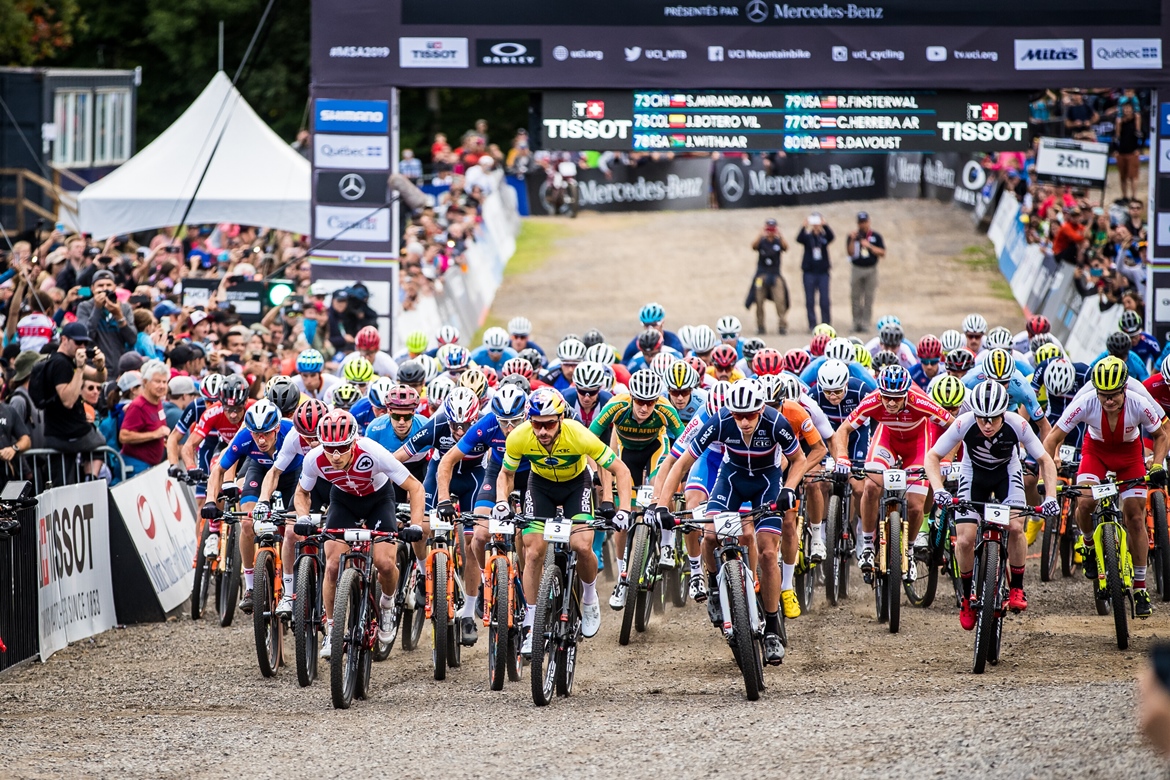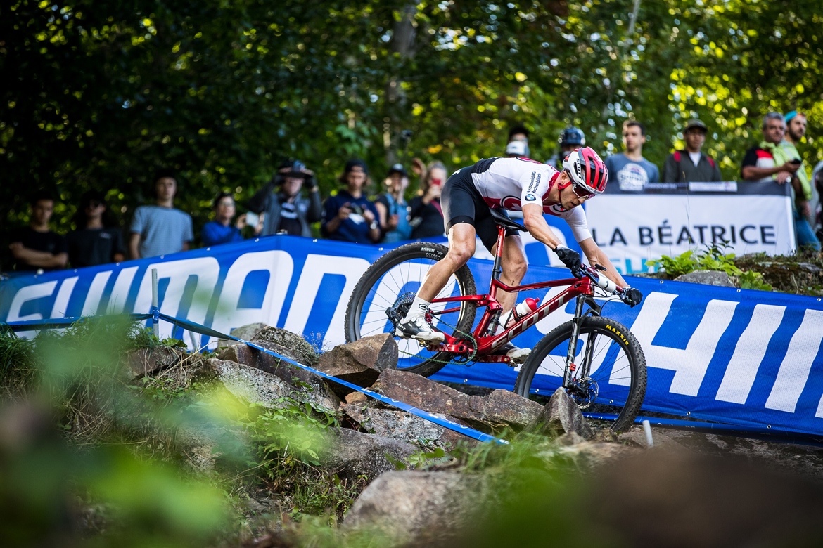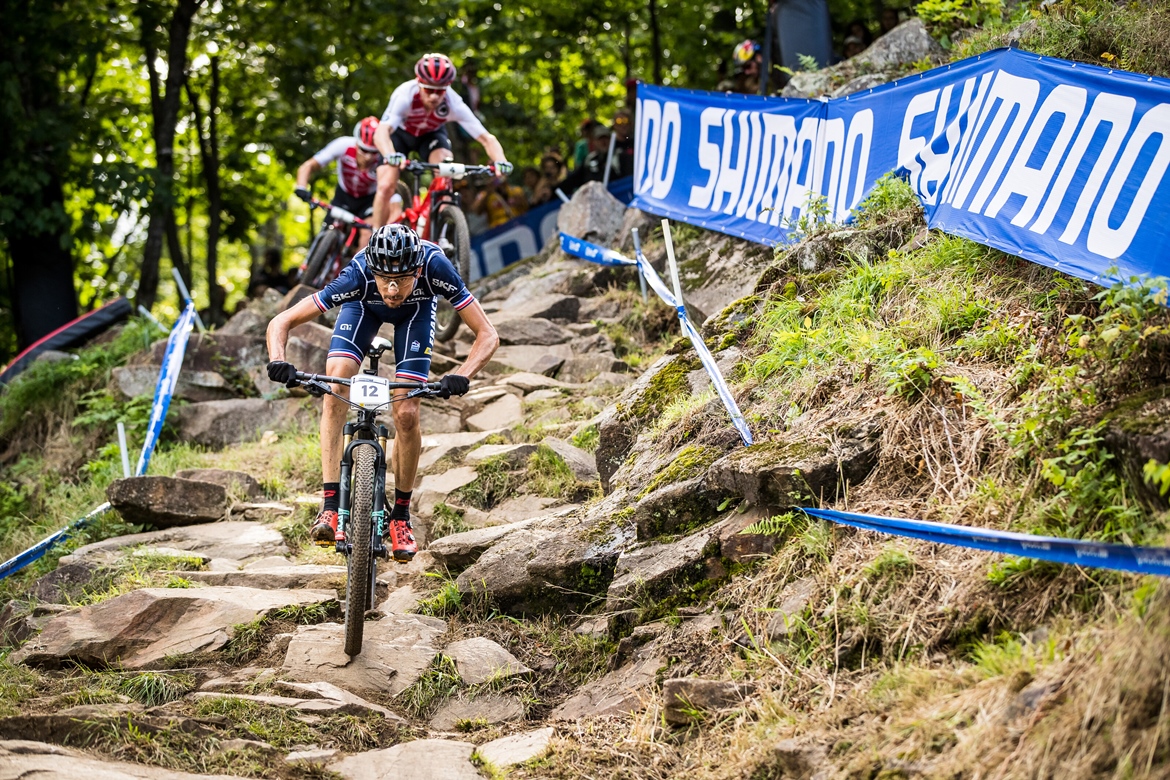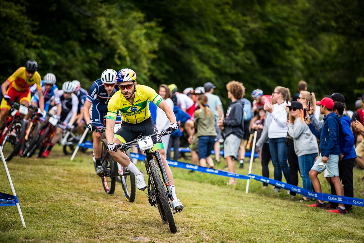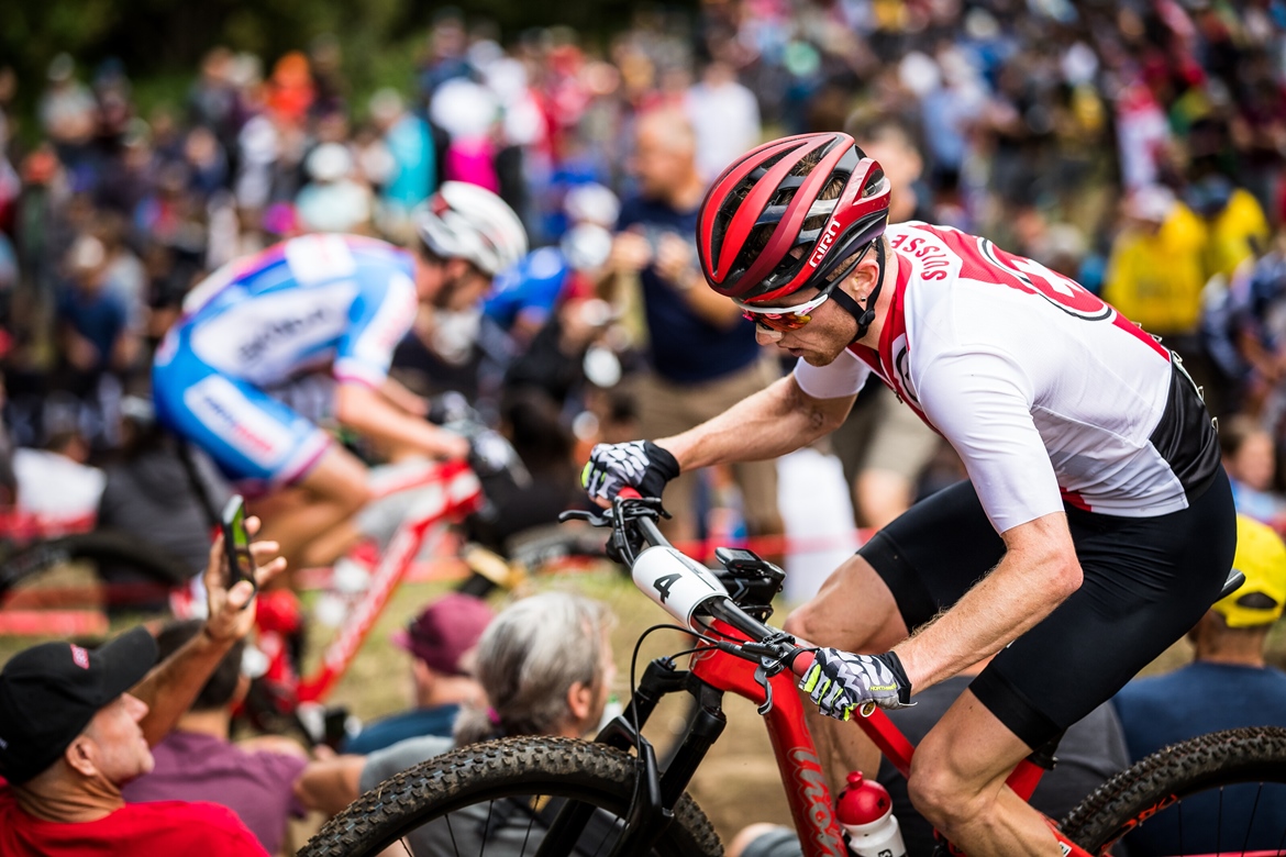 世界锦标赛,顶级山地车手纷纷换上国家队战衣,组队为国争光,XC项目中来自欧洲大陆的瑞士、法国等都是山地越野传统强国。比赛一出发,来自瑞士的尼诺·舒尔特、马赛厄斯以及新兴国度的巴西车手恩里克·阿万奇尼(Henrique Avancini)率先组成了突围集团,绝尘而去。