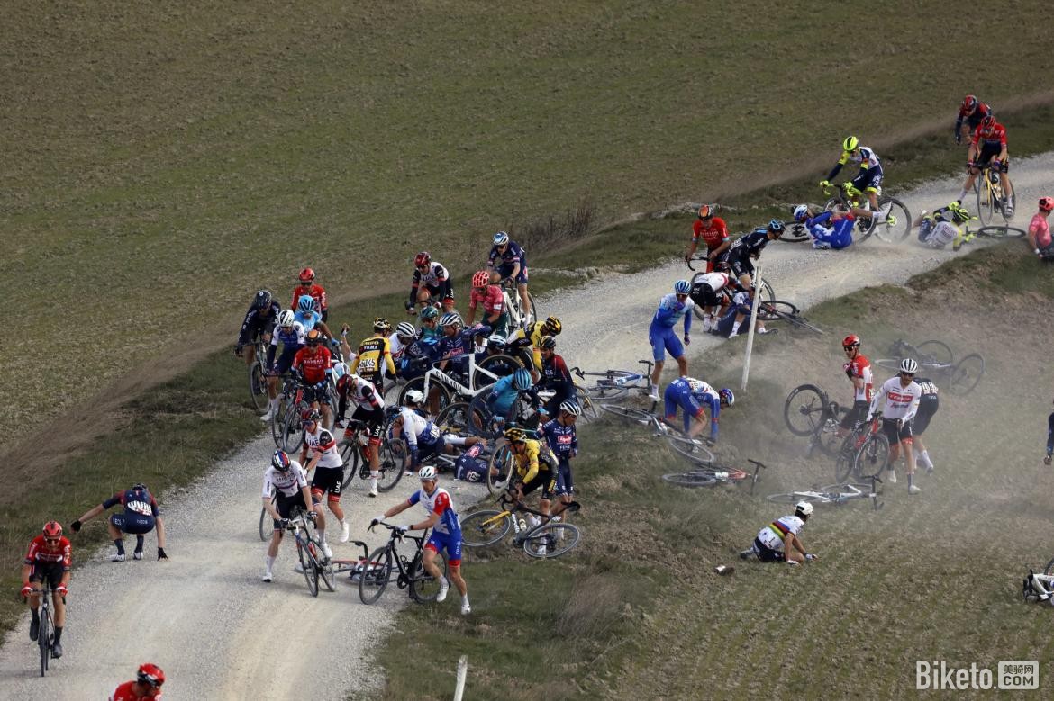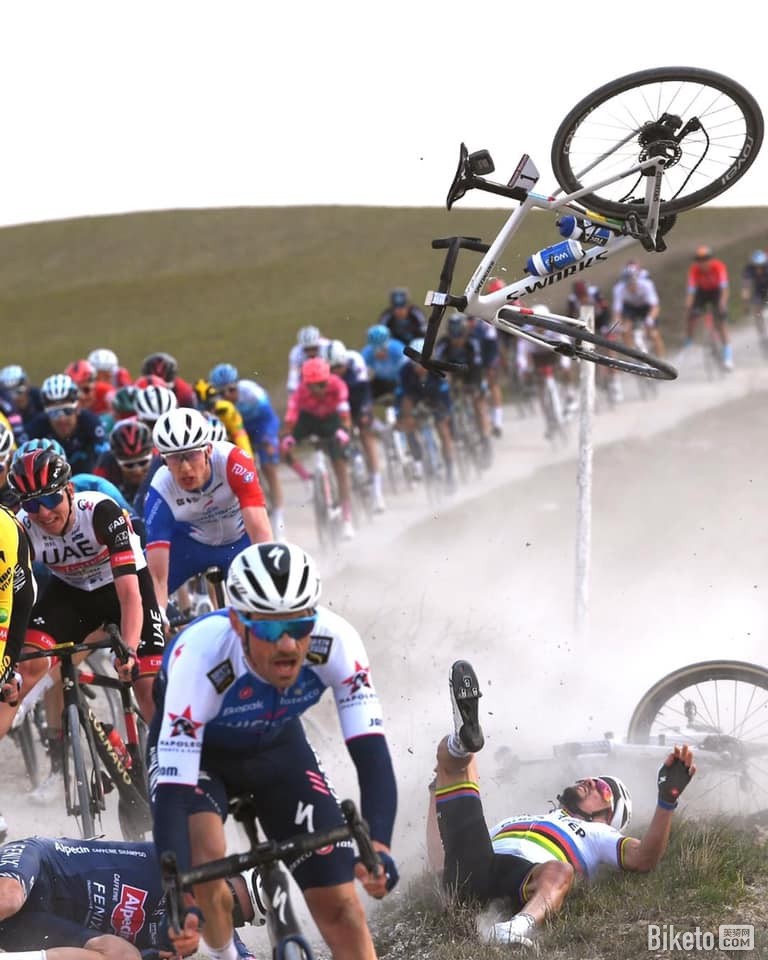除了诸多表现出色的选手,比赛上发生各种精彩瞬间也白路赛的“惯例”,比如今年世界冠军、白路赛大热门阿拉菲利浦的360°腾空翻转的赛事瞬间。这个画面是发生在开赛80公里后,真的非常酷炫,不仅有阿拉大神的“吸睛”表演,还有画面上的一半人以上都重重的摔在地上,仅仅用惨烈不足以表示这种激烈的程度。唯一值得让人庆幸的是,大神不愧是大神,阿拉菲利浦最后还能在队友的协助下重返主集团,摔成这样的还能坚持比赛,这种精神真的让人敬佩!
