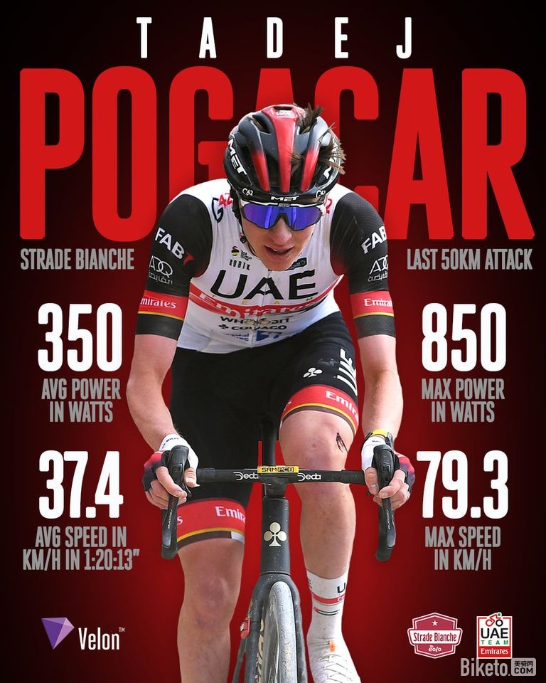 我们来看一组数据,你就明白波加查这次白路赛发动的超长距离单进攻有多么逆天了!他用时1小时20分13秒拿下了这个比赛,平均时速37.4KM/H,平均功率高达350W,按照他66KG的体重计算,功体比高达5.3W/KG,再加上其中的诸多下坡路段,最大时速达到了恐怖的79.3KM/H,即使我们在去年环伦巴第的单飞中就知道波加查的下坡功底非常出色,但是这个数据也太吓人了。而且要知道,在前面的狂风大摔中,他的左臂和左腿都因为摔车受伤,背部也遭受一定程度的撞击,顶着这样常人无法忍受的剧烈伤痛,还开启了这么逆天的超长距离单进攻。