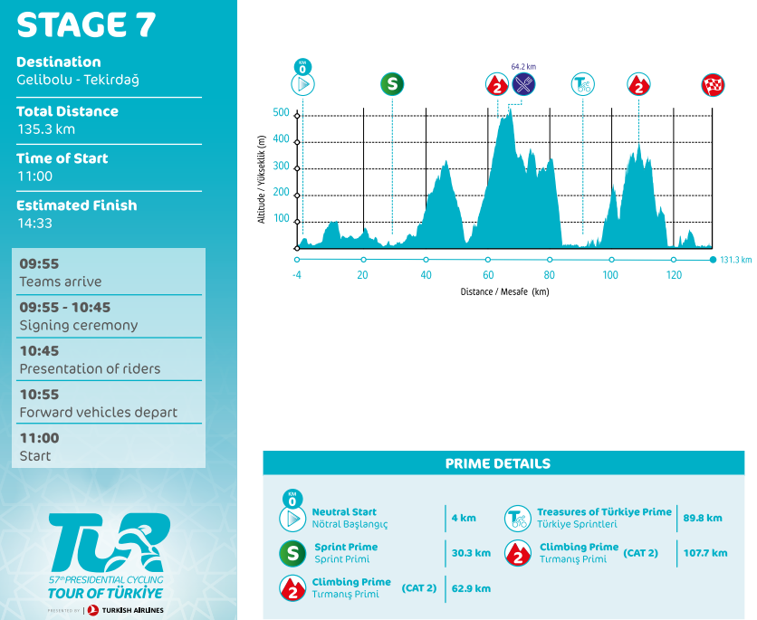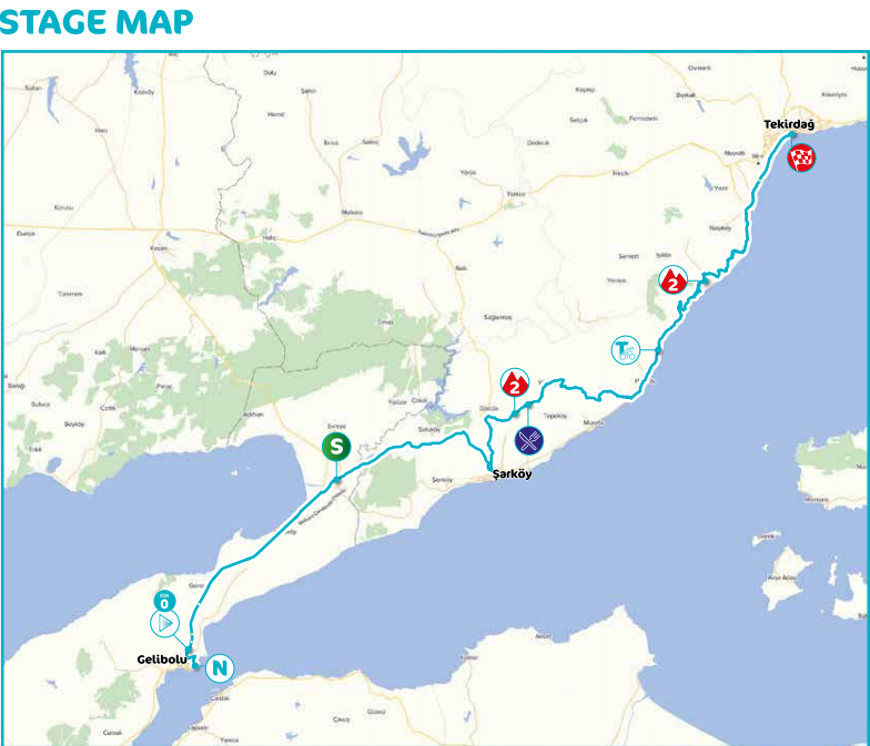 环土耳其S7(盖利博卢——泰基尔达)将于北京时间4月16日16:00分开赛,本场比赛从盖利博卢向泰基尔达进军,比赛赛程135公里。设置3公里荣誉骑行,1个途中冲刺点(33公里),2个途中爬坡点(62公里处2级坡、107公里2级坡),之后经过一个起伏坡后为平路,预计以以集团冲刺收尾。
