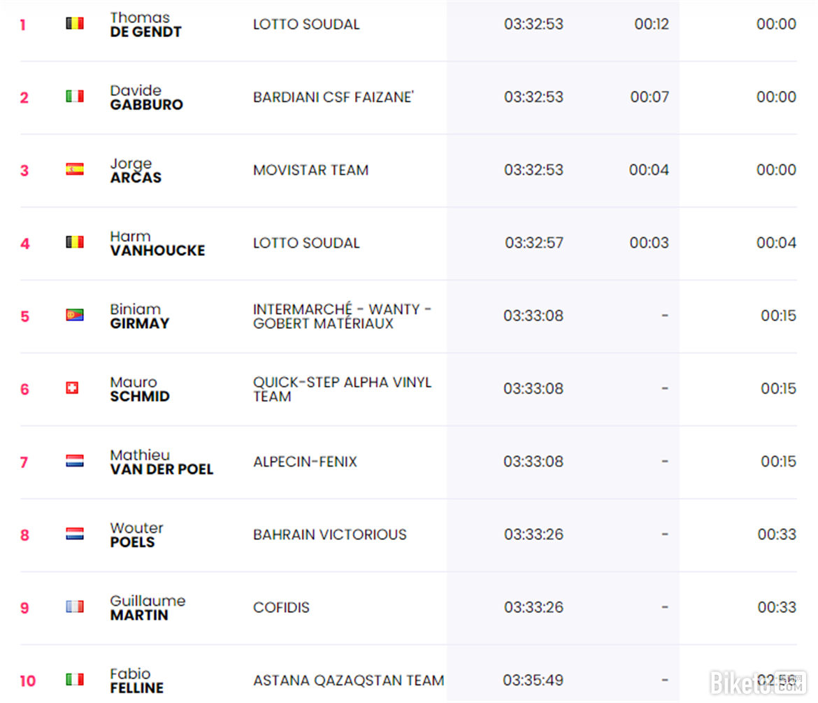 距终点4公里,范德普尔在下坡中提速,吉尔迈·海鲁独自响应。1公里拱门,两个集团秒差为9秒。距终点400米,彪哥频频回头放弃了终点。最终,在后40公里承担大部分领骑工作的托马斯·德根特在队友哈姆·范霍克协助下拼下单站,达维德·加布罗与豪尔赫·阿卡斯不是对手,分列二三。
