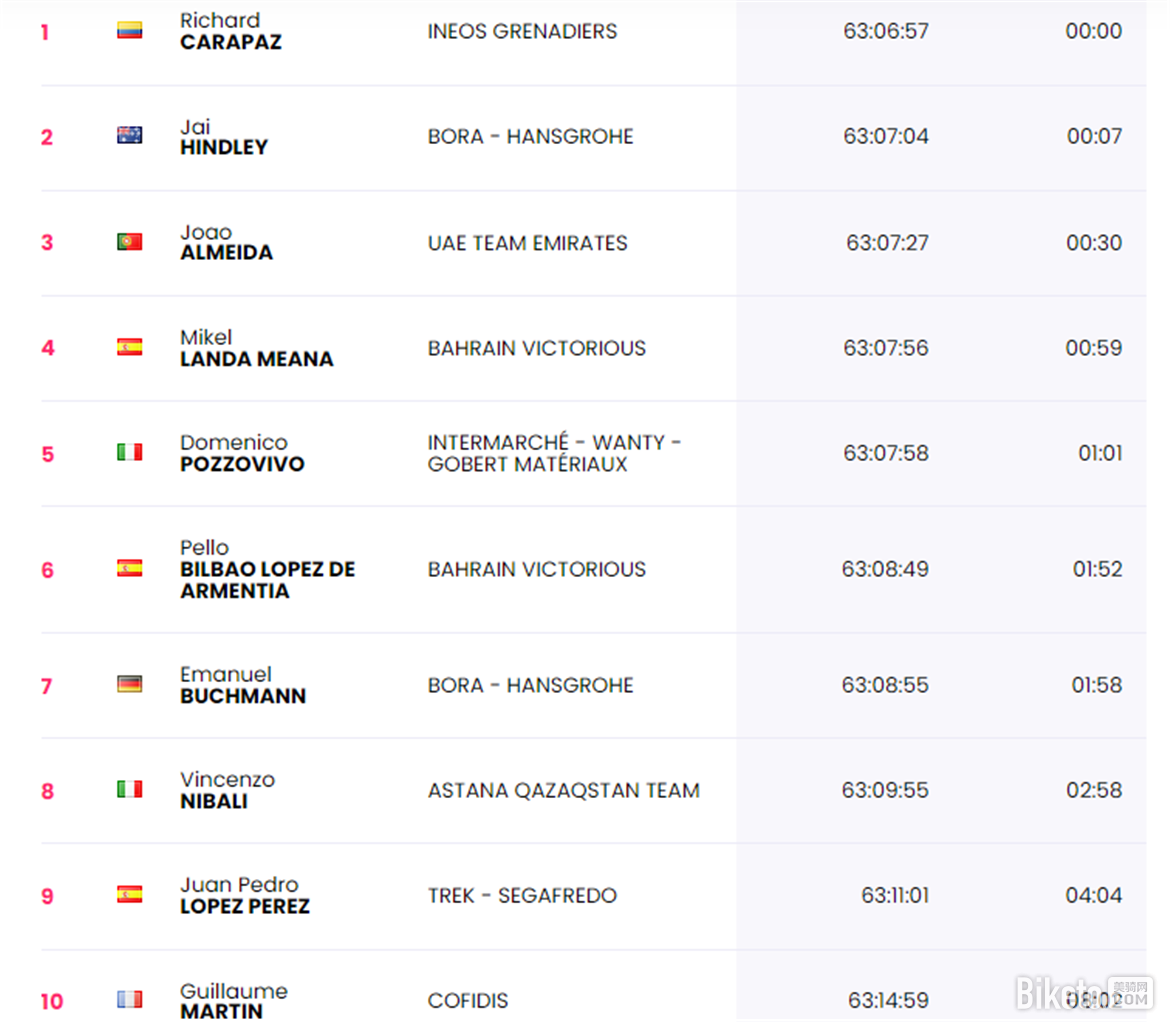 总成绩方面,纪尧姆·马丁凭借突围抢时间再次来到总成绩前十。领骑衫方面,卡拉帕兹继续保有总成绩领骑粉衫、德马尔继续保有冲刺王紫衫、科恩·鲍曼抢下爬坡王蓝衫、阿尔梅达继续保有最佳年轻车手白衫。