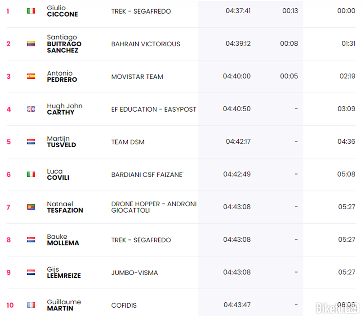 最后一个爬坡科涅爬坡开始后,距终点21.4公里,朱利奥·奇科内从五人最后方尝试进攻,布伊特拉戈与休·卡锡起身响应,二人咬住了这把进攻。休·卡锡稍作领骑后,同样尝试进攻被奇科内追回,布伊特拉戈落在后方。距终点18.8公里,朱利奥·奇科内再次提速,休·卡锡无力响应。回头一瞥,脚步坚定,朱利奥·奇科内独自完成余下科涅爬坡奔向终点,斩获单站冠军!爬坡1V1当中,休·卡锡被布伊特拉戈与佩德雷罗先后超越,最终收获单站第四。