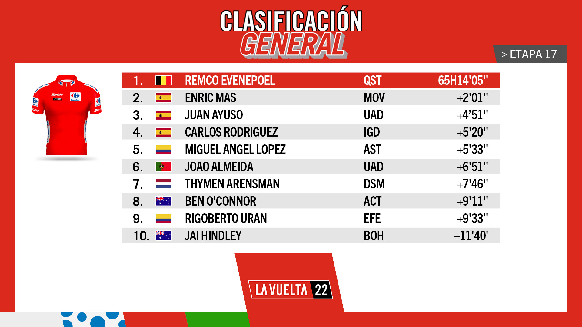 由于马斯和艾菲内普尔同时过线,在比赛结束后,各条战线均未发生变化,艾菲内普尔拥有红衫和白衫,佩德森拥有绿衫,维恩拥有圆点衫,9月8日,环西进行S18赛段,敬请期待。