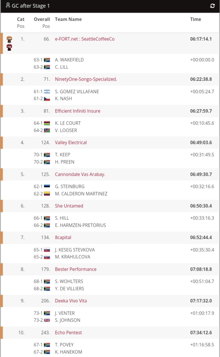 揭幕赛段的冠军Sofia Gomez Villafane 和 Katerina Nash(NinetyOne-Songo-Specialized车队)在后半段的赛程中积极进攻,落后五分半钟获得赛段第二。总成绩也滑落至第二位。