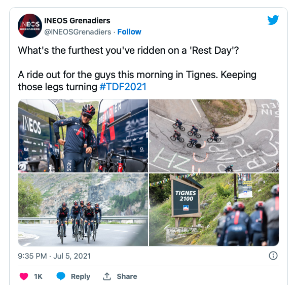 “你在‘休息日’骑行的最远距离是多少?”Ineos Grenadiers的官推上写道,并附上了车队出发骑行的照片。