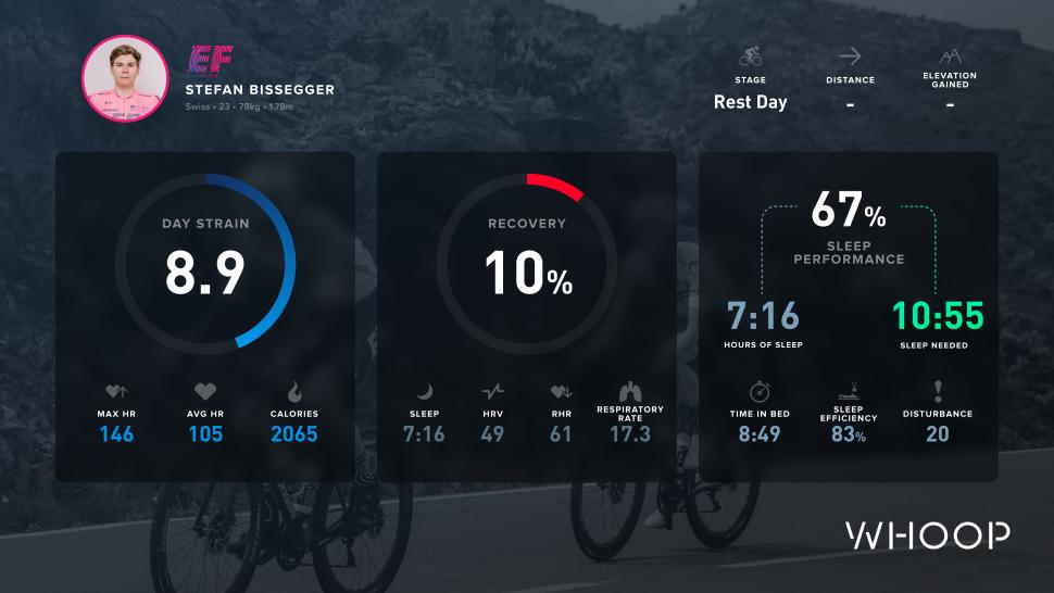 上图显示了EF Education车队在2021年世巡赛前九个阶段以及第10天(休息日)期间收集的数据。首先看上部蓝色的线,日间压力确实很高:日间压力的数值从0到21,它测量一天总心血管负荷,有六个赛段均超过20,在这些赛段爬升均超过1600米,而在恢复日,这一数字大幅下降至13.2。现在再看恢复百分比,在休息日前三天累计骑行546公里、爬升10969米之后,休息日的红色28%说明了一切,恢复日绝对是必要的。