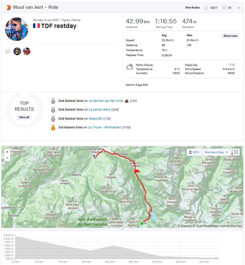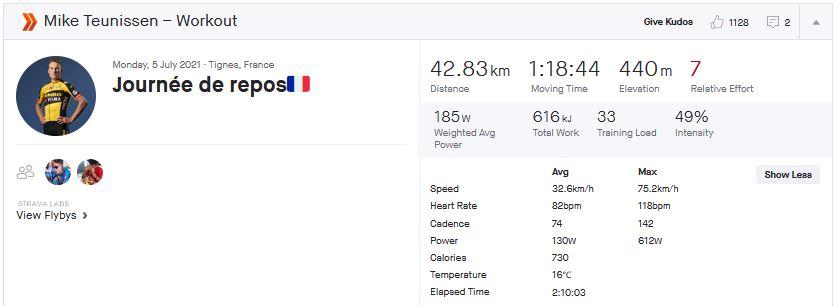 不过,降低日间压力并不意味着完全不骑行。例如,为了恢复腿部肌肉,Jumbo-Visma车队的小伙子们在2021年环法第一个休息日前往Tingnes进行了两个小时的骑行。根据Strava上的数据,看到Wout van Aert在42km的骑行中有474m的爬升,平均速度为33.5公里/小时。队友Mike Teunissen也将他的骑行记录上传到了Strava,他有完整的心率数据和功率数据,在整个骑行过程中,他的平均心率为82bpm,最高心率为118bpm。平均功率为130瓦,其中有一段20分钟的功率约为235瓦。