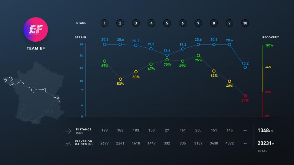 EF Education Nippo车队(现为EF Education-EasyPost)与Whoop合作,深入了解个性化生物识别数据,包括心率变异性、静息心率、呼吸频率和睡眠表现,以优化车队中每位车手的恢复效果。