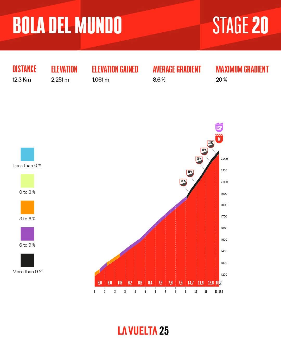 纳瓦塞达山(坡程12.3公里,平均坡度8.6%),其中最难部分在3公里,几乎是山区防火通道路段,属于坡度大、路况差路段,对于总成绩战线选手而言是必须跨过的坎。