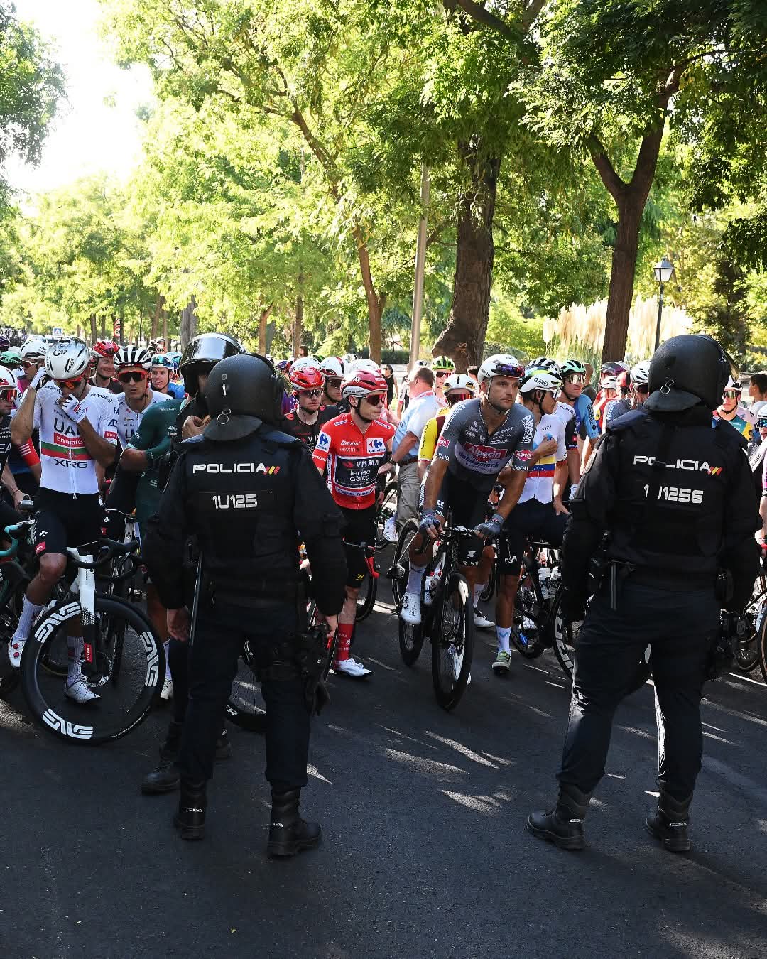 随着大集团即将进入马德里市区开始城市绕圈阶段前夕,当地因巴以冲突外溢支持巴勒斯坦的人士越来越多侵占赛道示威游行,抗议以色列博泰车队“一如既往”留在赛场,并且该车队选手里特奇洛有望在赛后身着白衫接受颁奖。