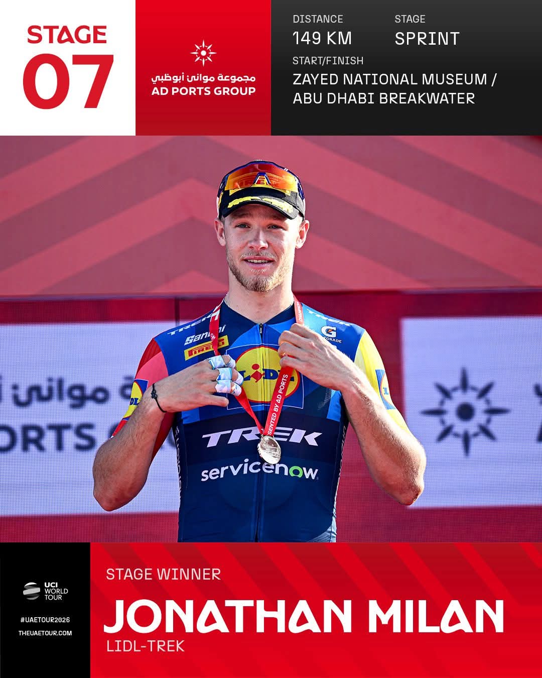 2026环阿联酋S7(扎耶德国家博物馆 - 阿布扎比防波堤)落幕,大集团在终点前2公里附近追回突围选手后迎来冲刺大战,米兰(崔克车队)在最后300米发起总攻,德尔托罗(阿联酋航空车队)跟随大集团安全完赛顺利问鼎赛事总冠军。
