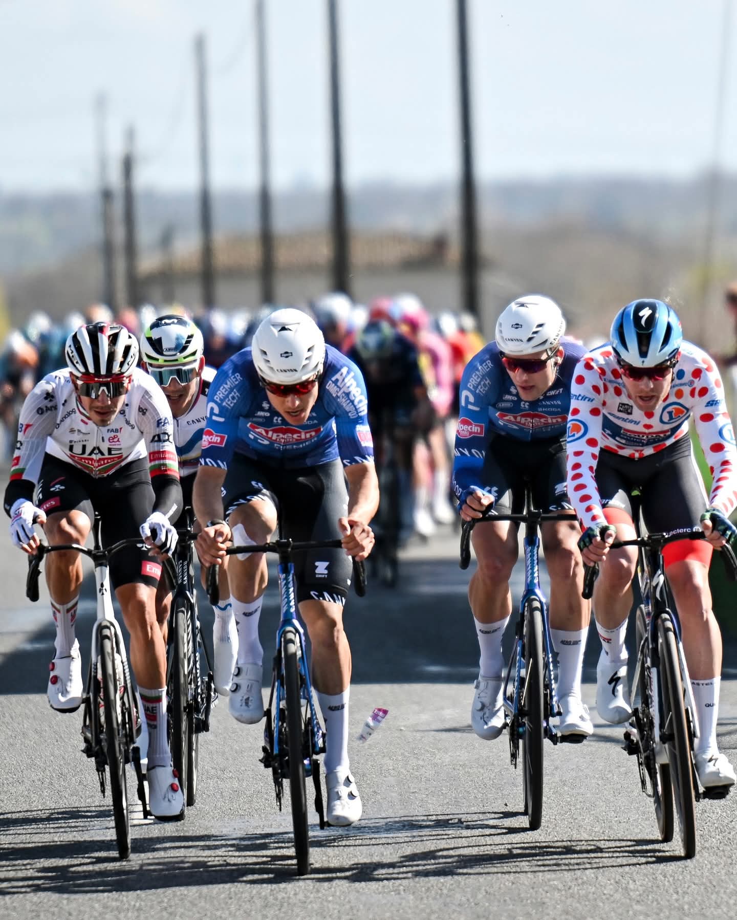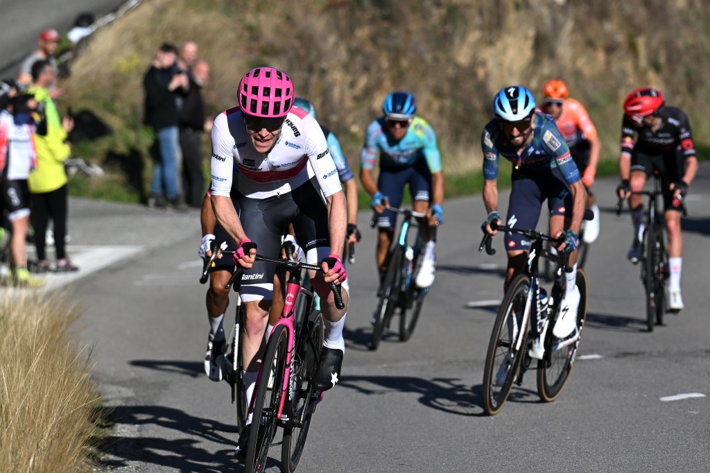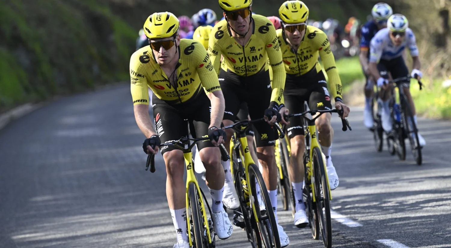尽管大集团内又有三名选手成功加入前方突围集团,但是对于志在扩大总成绩领先优势的维斯马车队而言影响有限。随着双方均通过途中冲刺点后,此时双方之间的秒差仅剩不到1分钟。面对接下来连续四个陡坡,突围集团率先出现分化。