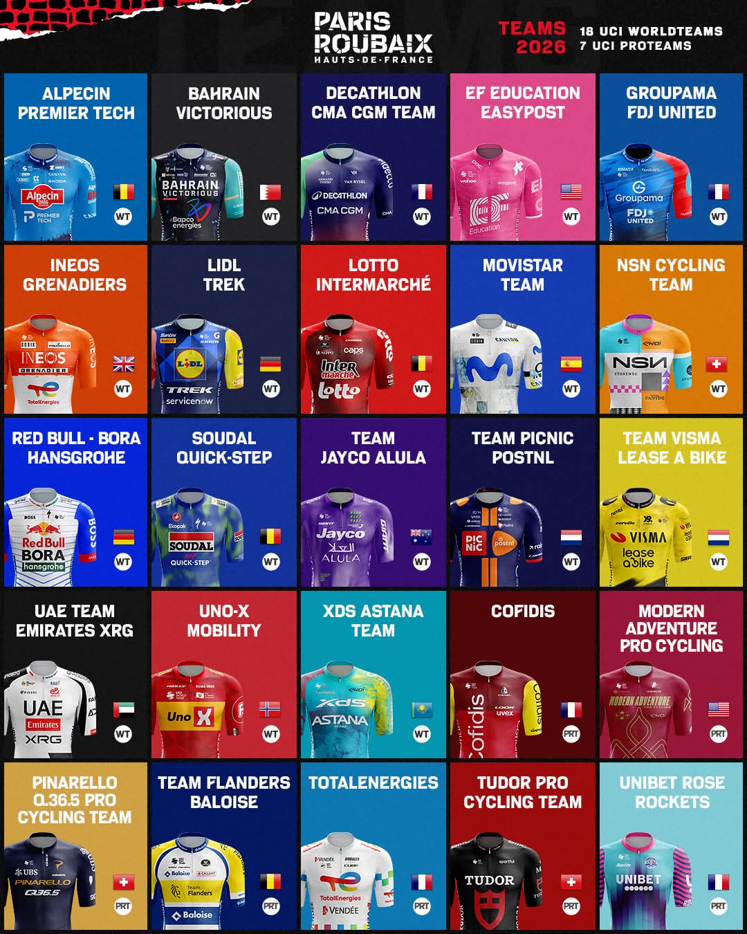 根据UCI规则,“巴黎-鲁贝”作为UCI世巡赛级单日赛,共有25支车队参赛,其中有18支世巡赛车队和3支排名最高洲际职业队“直通”赛事,组委会另外给四支洲际职业队发放“外卡”。