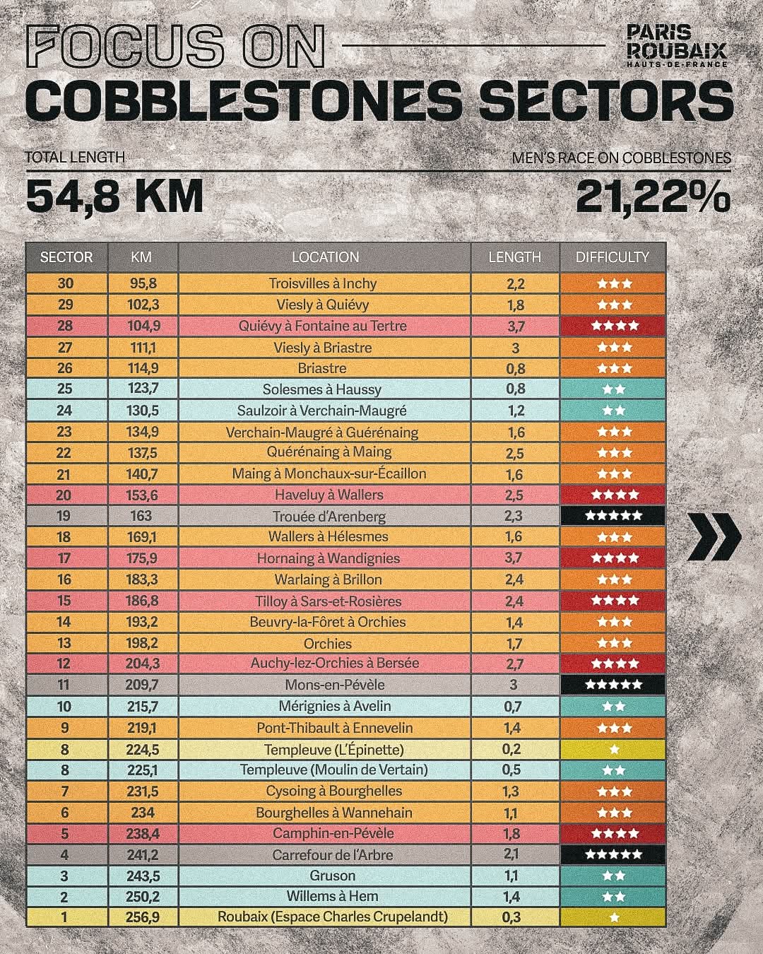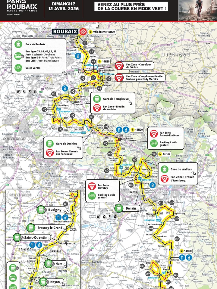 比赛起点从贡比涅出发,经过30个鹅卵石路段(约54.8公里)后,抵达终点鲁贝竞技场,全程258公里。