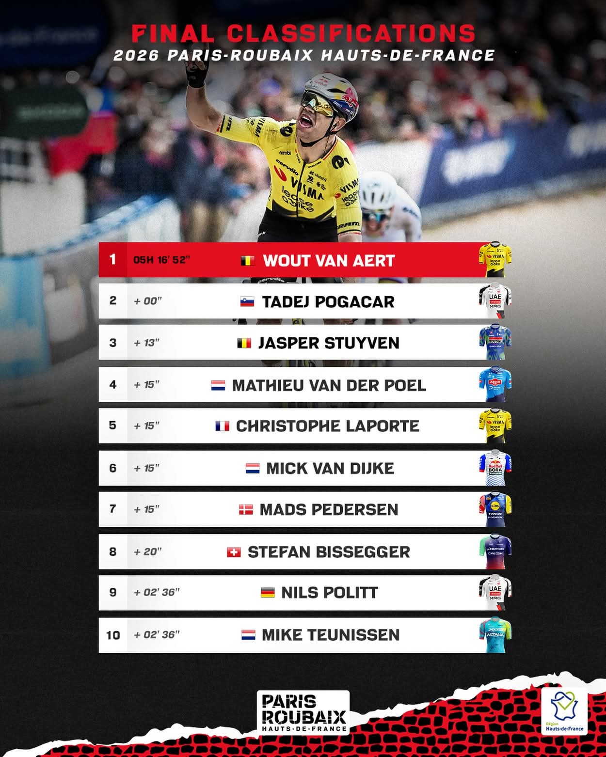 最终,范阿尔特赢得职业生涯第一场巴黎-鲁贝赛冠军,这也是维斯马车队在本赛季取得份量最重世巡赛冠军。不仅打破2024-2026赛季竞技状态如日中天的波加查连战连捷创造历史的神话,有利于维斯马车队备战7月环法赛重夺总冠军建立信心。而且还用实际行动向其他参赛车队证明,拥有波加查的阿联酋航空车队并非战无不胜。