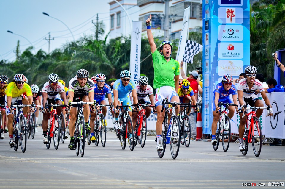 荷兰禧玛诺洲际队车手Kenny Van Hummel冲刺手右手举起示意胜利