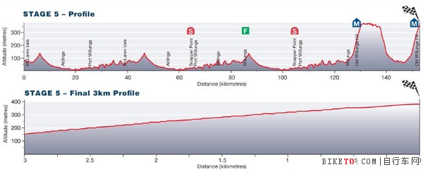 海拔图告诉你为什么这个赛段是“皇后赛段”。Old Willunga Hill的平均坡度高达7.6%,并且需要爬2次!终点前300米的赛道也是全程爬坡,坡度超过7%。由于最后一个赛段是平路赛段,所以这个赛段将决定胜负。