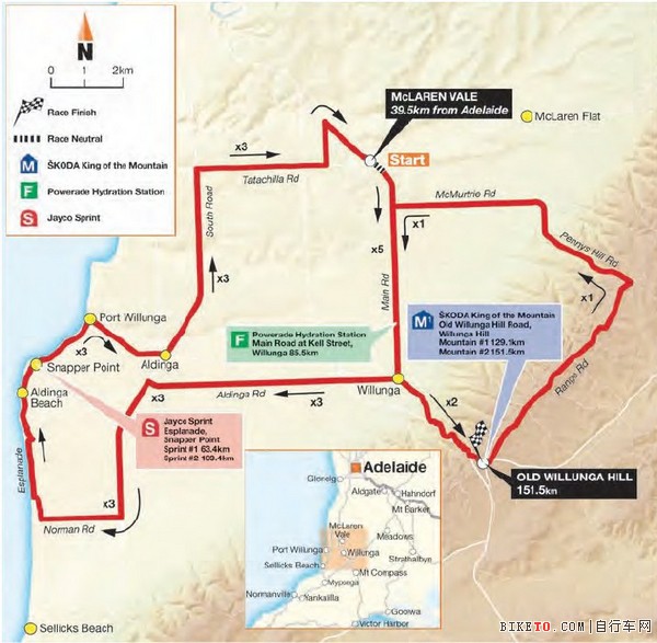 比赛赛道呈“8”字形,总里程151.5KM。起点是McLaren Vale,一小段中立骑行后,大部队将首先沿着左边的大圈绕行3圈,第三次通过起点后再沿着右边的小圈绕行2圈。第二次通过Old Willunga Hill则是本场比赛的爬坡冲刺。