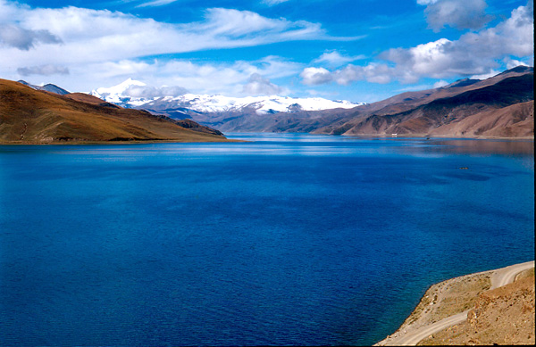 公路沿着宝蓝色的羊湖岸边蜿蜒。当地人将“羊卓雍错”称为“神女散落的绿松石耳坠”,这个比喻非常形象。从卫星地图上俯视整个羊湖,它就像一颗碧绿的耳坠镶嵌在山的耳廓上,湖岸曲折蜿蜒,形状像是一根珊瑚,分支繁多。无论站在哪个山头远望羊湖,都无法看到整座湖的全貌。我们沿着湖边骑行,恨不得把自己永远镶嵌在这幅美丽的风景中,恐怕这是其他旅行方式无法体会得到的。