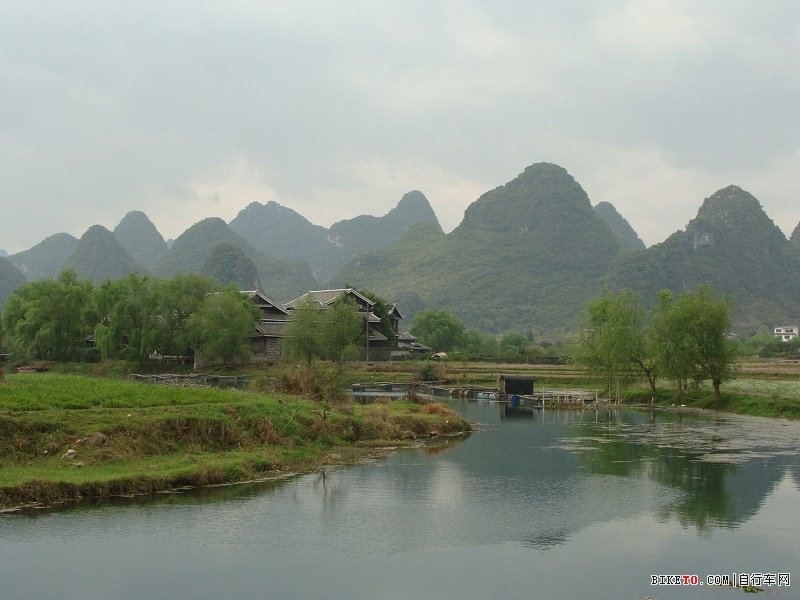 早晨6点半出发,中午到达阳朔,在步行街附近住下,下午骑车浏览风景。
