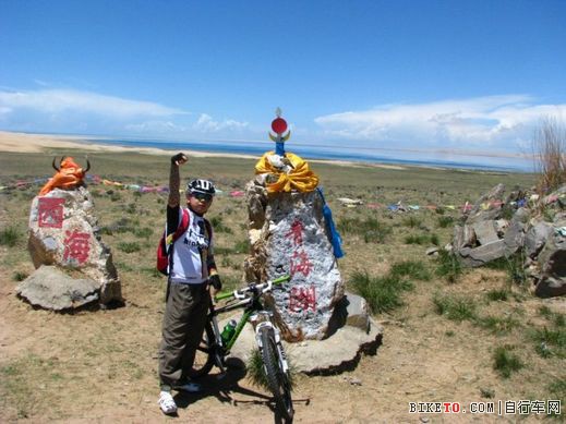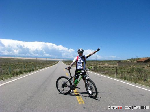 环湖东路,丘陵地带,由于是高原地带,虽然服用了红景天,可是还是不敢将速度提起来,所以一直保持着18-20码的速度巡航,骑行在环湖东路上,抬手就可以捕捉一张windows桌面级的风景照,这个风景让我深深陶醉,忘却那所谓的烦恼,驰骋在这碧海蓝天之中,胯下的rockhopper也显得是那样兴奋。