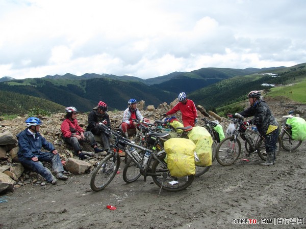 15分钟过后我和子唯两个也开始推车上垭口,大概还有3、4公里的路程,之所以推车是因为那路把车轮都黏住了,几乎骑不动的,除非自己想用自己的车子做赌注。熊侠就是因为这样把后拨给整断了,在离垭口不远的地方上车用力一蹬,川藏线就接近报废了。链条卡死在牙盘和后飞里面,后拨也卡在后飞里面动不了,需要截链器等工具才能修,只能在路边苦等许哥接近一个钟头,本想弄成单速车,结果还是以失败告终,熊侠活生生又被坑了280块钱直接搭车去了理塘,这种悲剧相信不只在他身上发生过,川藏线也是很讲运气的,搞不好明天我就会成为今天的熊侠。