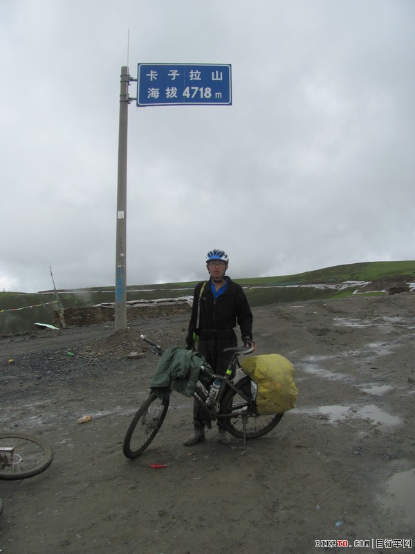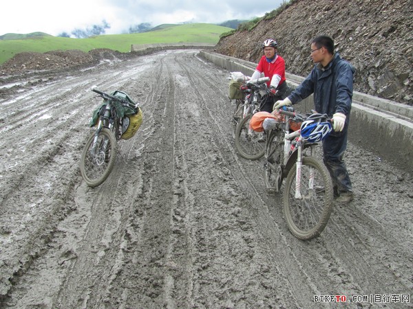 在卡子拉山垭口前的那段路烂的不行,完全没办法骑车,泥土对鞋子和轮胎的附着力很大,推车的时候也很吃力,脚下仿佛有5斤重的力在往地面拉,一个小时只能走大概3km。到垭口的时候码表显示走了11km,可这个时候已经是下午1点多了,还有六十多公里的路要赶,想想就觉得恶心,心里想着今天走夜路是必不可少的了,因为后面还有两座山要爬。