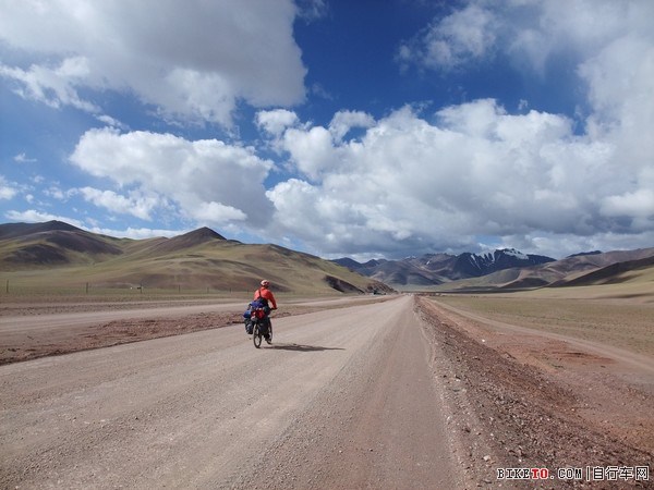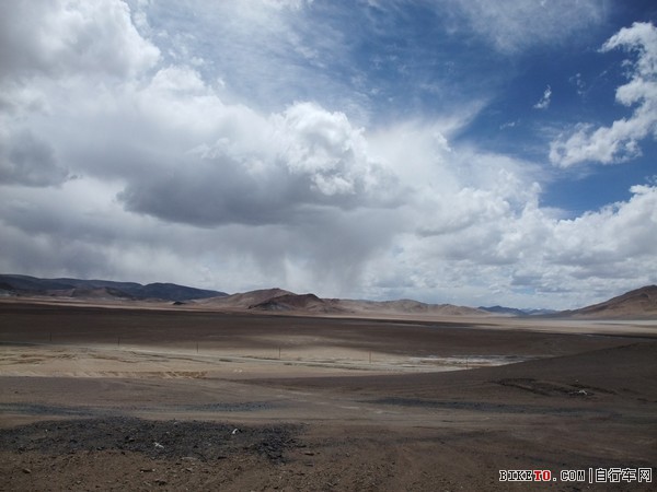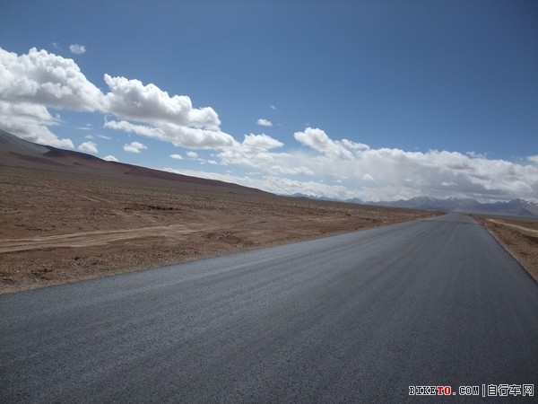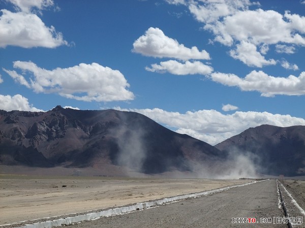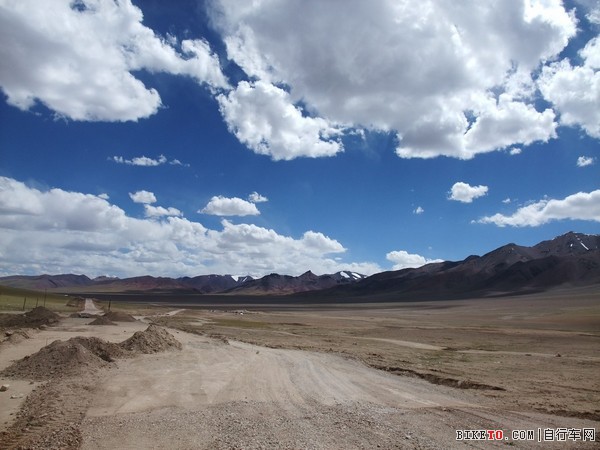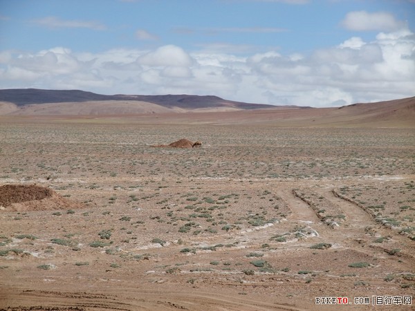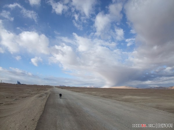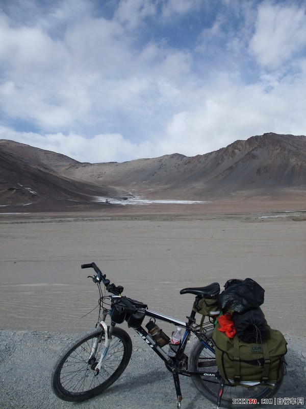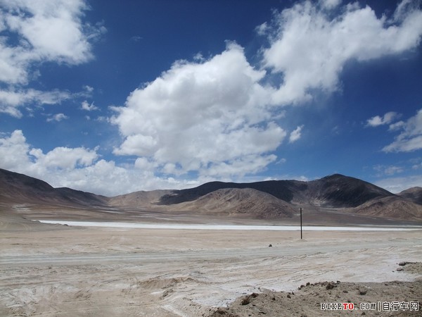停下检查,原来是一根细铁丝扎破了胎,在视角和小姜的帮助下很快换了备胎。只是在这海拔5000多米打气真是个体力活,三个人轮流几乎要崩溃也才打个半足,先凑合着骑吧。路边可见大片大片的白色,但那不是冰雪,是盐碱,所到之处,寸草不生。约两个小时后,爬上一个坡,路分成了两条。根据前面反骑车友的说法,右边的从甜水海中穿过去,要近十多公里,路非常烂,浮土加搓板。