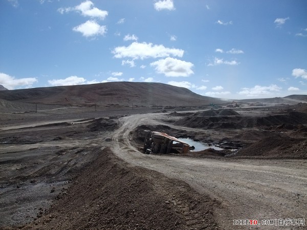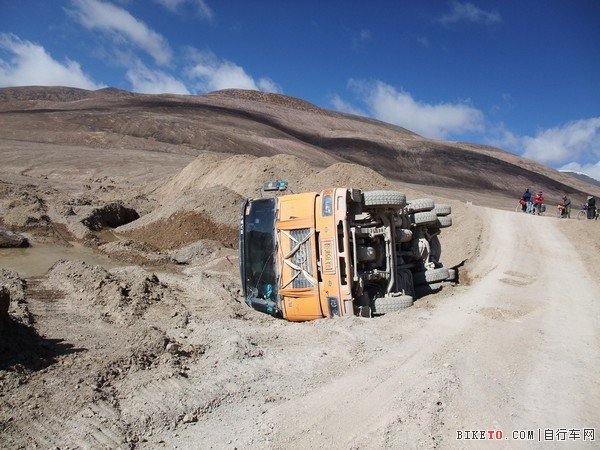 原有路基被开挖,只好走旁边的便道,路烂得不成样子,边骑边推,还得停下来让载满土石的大货。海拔已经5200米以上,大货在便道上也显得异常吃力,便道坑洼不平,满载的车身显得摇摇晃晃,我大声提醒离大货远点,结果刚把队友叫离几分钟,一辆超过我们的大货就摇摇晃晃的一声巨响翻倒在一个坡下,司机连滚带爬钻出来,跑去前方工地求救去了。