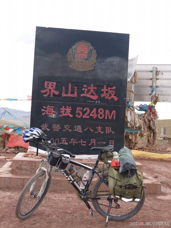 边推边骑,2小时后终于达到位于K217处的4950米麻扎达坂垭口,10公里用2小时,速度比昨天明显快多了,7月的山顶仍然积雪,穿好衣服后,开始下山。