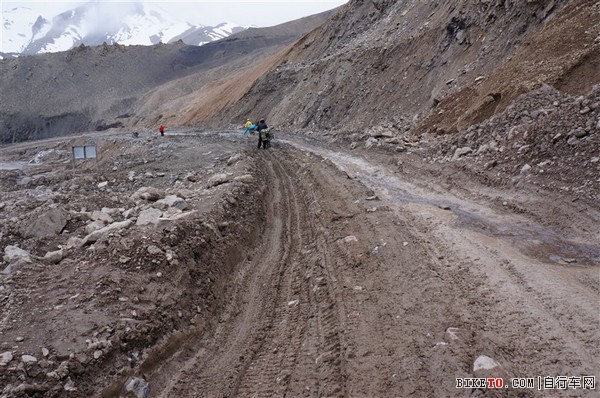边推边骑,2小时后终于达到位于K217处的4950米麻扎达坂垭口,10公里用2小时,速度比昨天明显快多了,7月的山顶仍然积雪,穿好衣服后,开始下山。