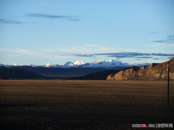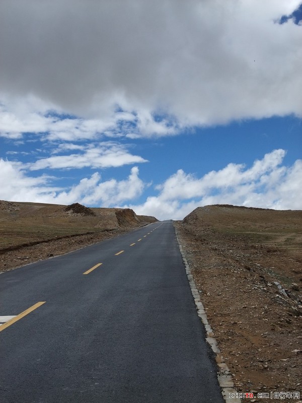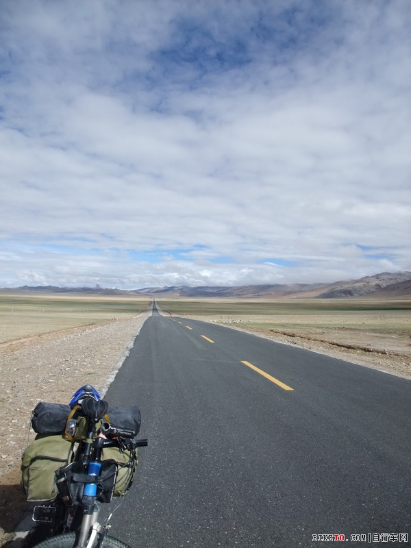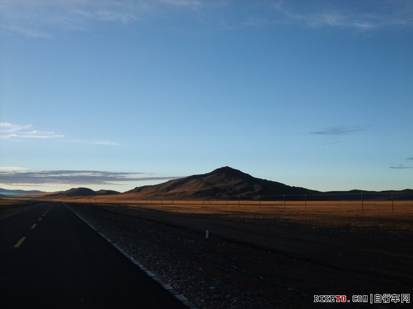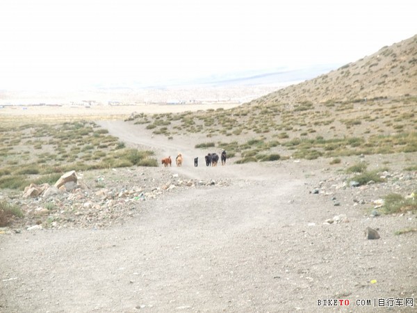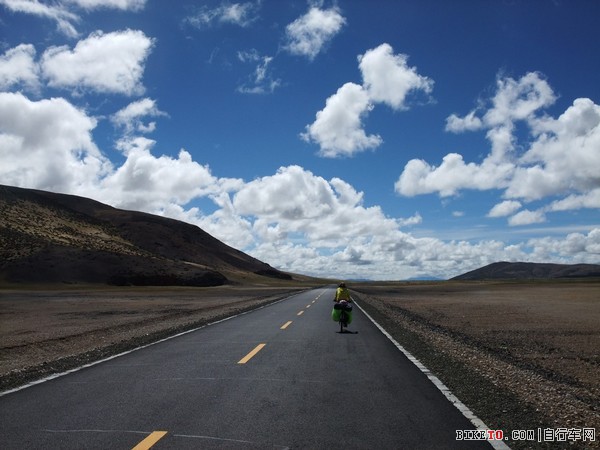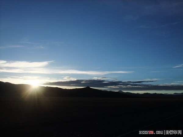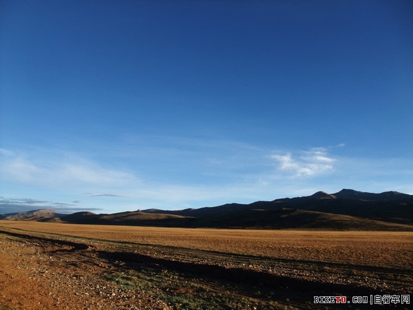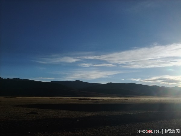出村就是上坡,路果然很烂,发现有新鲜的单车轮印,原来还有比我出发更早的。心想他应该也是打算一天到日土,不由得加力,打算追上一起走。快到坡顶的时候,终于追上,原来是那位骑折叠的63岁老爷子,他一路骑,一路搭车,也到了这里,另一位57岁的老鹰,则已早搭车去了阿里。跟老爷子告别后,继续骑上垭口,此时天已大亮。缓坡急下,相机也懒得掏,要赶时间,顾不得那么多。一直骑两个多小时后,才停下喝水小憩,原野空旷,寂静无声。