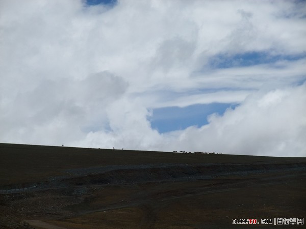 将要爬第二个垭口的时候,看到前面的山峦上有群藏羚羊,蓝天白云之下,高原的精灵,好似凝固的剪影 即使我走近,羚羊们照例低头吃草,无视之。不忍打扰,继续向前,垭口就在前方。