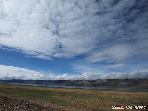 出来就是爬坡,气温有点低之后坡有点小陡,还顶着逆风,骑上去后,放了个很爽的下坡,见后面的没跟上,就独自往前骑了。10点多的时候,看到公珠措,一个狭长的咸水湖,一直绕着湖边骑了很久。