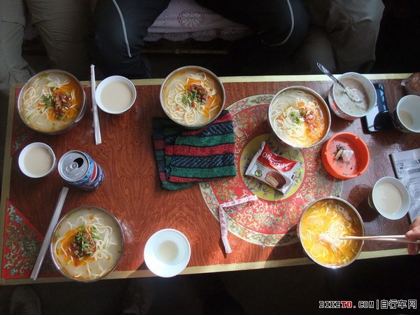 先是一人来了碗青稞面,味道极好,发现面汤是正宗牛骨头炖出来的,如是又每人来了碗牦牛肉饺子,还是用牛骨头汤泡,里面再放点青菜叶,还揉了点糌粑,要了壶酥油茶,边吃边逗老板娘的可爱小子,吃到后来都有点不想走了。