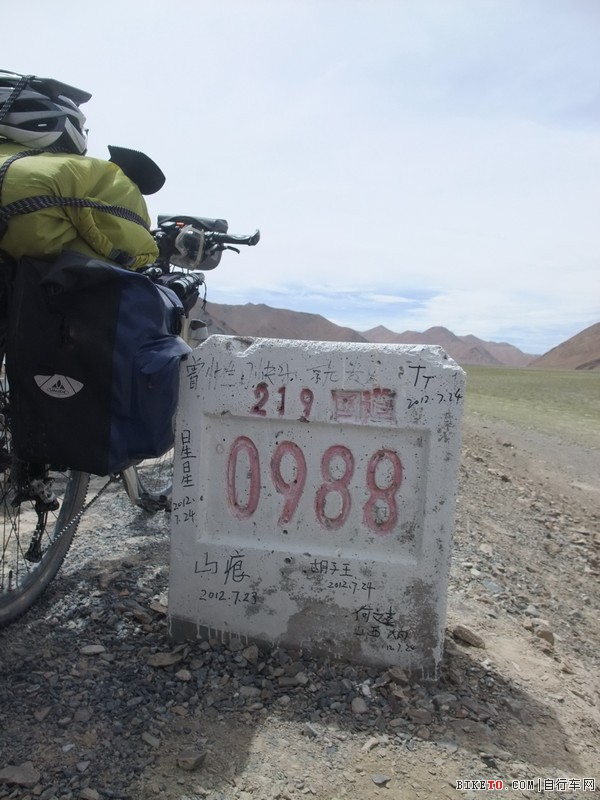 继续往前,不久就碰到老李重庆队他们在休息,而大哥因为拉肚子落在后面,一起停下等。K1020开始爬坡,虽然路面很好,但坡度较大,还是有点吃力。K1025到达坡顶,海拔4875米的拉梅拉山垭口。再往前36公里全是下坡将到达阿里地区首府所在地狮泉河。