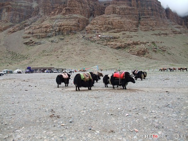 12点的时候,走到正式的徒步起点,其实这6公里可以坐车的,很多旅游观光团都是坐车到此。徒步起点这里非常热闹,有众多的牦牛,马匹,运送游客和补给的车辆,从煤气罐,氧气罐到酥油糌粑,这些东西的主要顾客是人数众多的印度朝圣者。