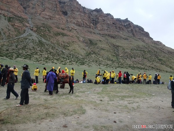 黄色衣服的即是印度转山客,人数众多。藏族朋友把印度转山者围住,希望能提供马匹或向导服务。