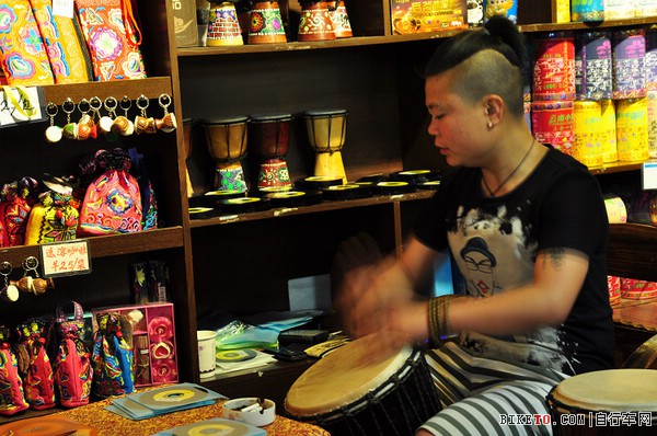 昨夜由于灯光昏暗,装车时将前轴上一侧的垫片丢失,导致前轮不能锁紧,随时有掉下来的危险,这可咋办? 正在推车行走时后面一位骑友上来,看我带着重装行李问我哪儿来,要去哪儿?正愁找不到车行哪,赶紧询问,大姐(赵姐)见我的车是TERK,就直接带我去TERK车店,行进中电话通知车友等她,原来她们今天有活动,不好意思,耽误大家时间了!到了车店技师出去骑车了,让店里的员工帮忙找来废旧螺母,从中挑选一个大小、口径合适的,外加一个垫片,装上以后正好能够锁紧,这下好了,车子可以正常使用了!