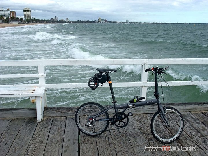我的爱车——小折P9,在墨尔本的圣基尔达海滩(St. Kilda Beach)。原为本田OEM版P8,被前一位主人烤了灰色漆,二手收来1600,我又改了9速,换了指拨和海绵把套。