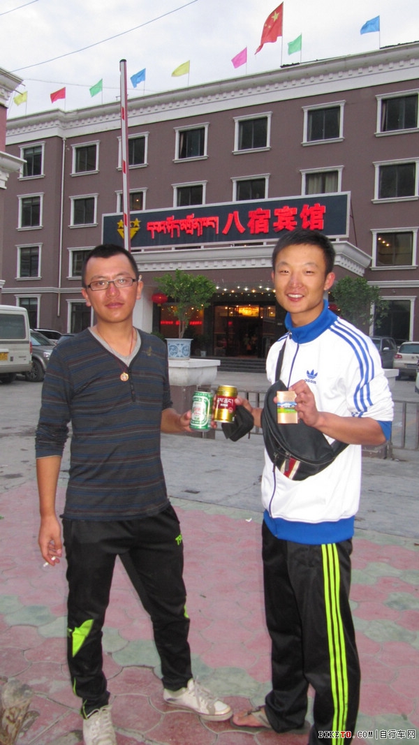 在八宿吃了顿火锅,为了节约,我们偷偷买了脆皮肠放进锅里,不过还是花了两百大洋。在八宿休息了一天,把堆积如山的脏衣服给洗了,这是我和邓总在八宿最大的宾馆门前的合影,我们手里分别拿的是拉萨啤酒,青稞酒,高原香烟红景天。(其实我们不住这里,只是在大宾馆门前照相有面子些)