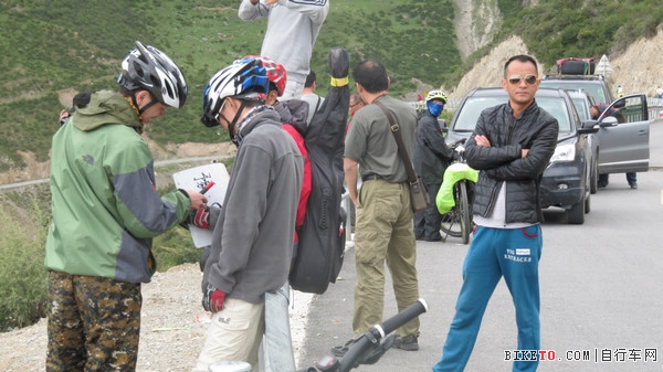 此时气温已经很低了,套上雨衣都会很冷,我们看见一个依然穿着短袖短裤的哥们,原来他的衣服都给搭车的队友带去然乌了,我赶紧借了件冲锋衣给他,邓总也把雨披借给了他。