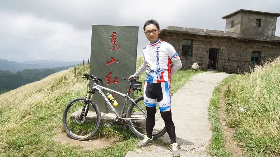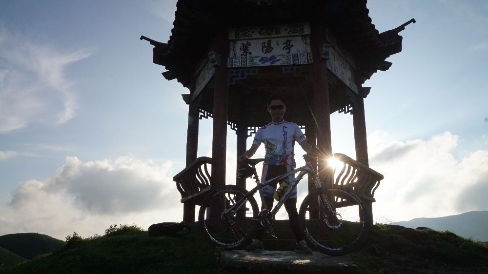 紫阳峰。南山牧场一座小山头,后修建一座凉亭。因赵紫阳造访时,恰逢紫气东来,后人命名此地紫阳峰。当我把单车推上凉亭时,恰好有一段路比较平坦,忍不住骑一下。