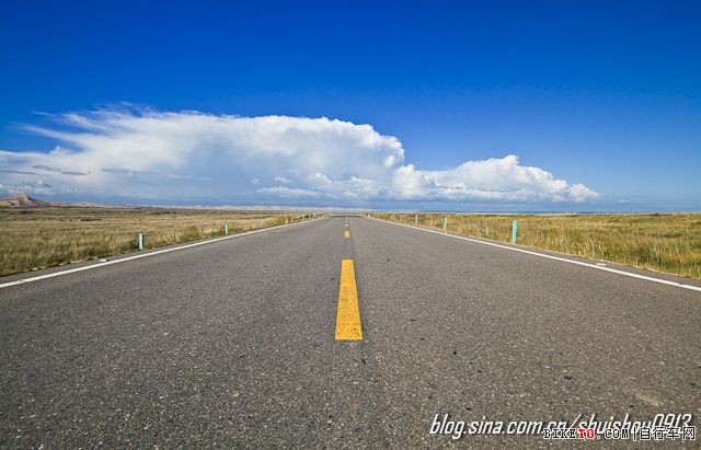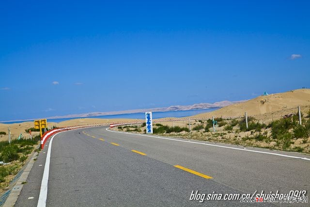 延伸中的环湖东路,一边是沙漠,一边是湖水(图片右侧地平线上的一抹蓝色即是)。
