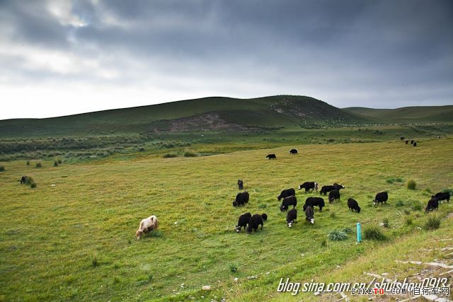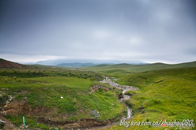 起伏的山峦,青翠的草原,即使是乌云压山的天气,可风景依旧是这么美。只希望一会儿不要下大雨,不然我就哭了。