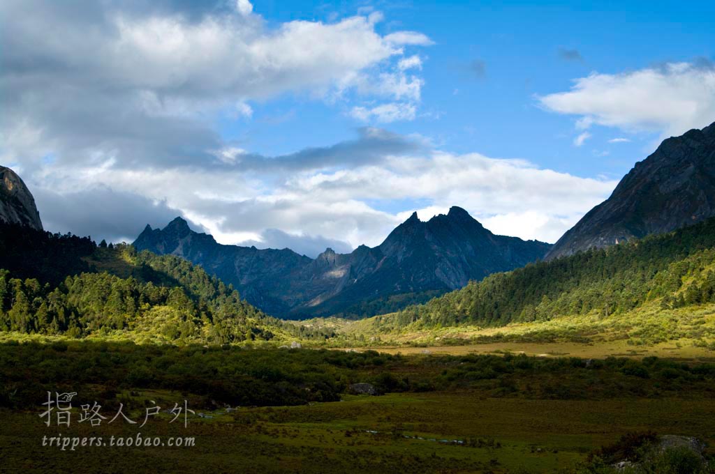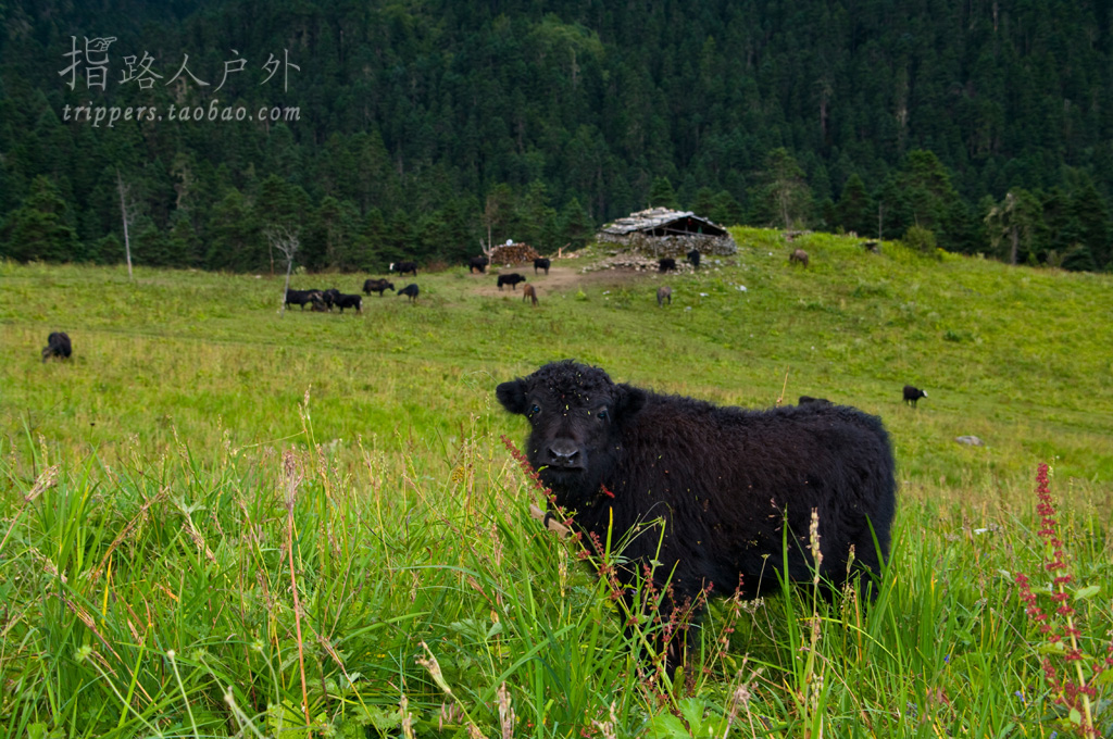 选择去这个山谷,是因为这个山谷里的一连串的牧场。想象一个又一个青青的牧场散落在长长的山谷里,牧场上毛绒绒的小牦牛撒欢跑来跑去,巨大的粗壮愤怒的公牦牛像个坦克一样缓缓走动;清澈碧兰的溪水蜿蜒流过,周围是深绿的一片林海,这样的景色绝对不会差。