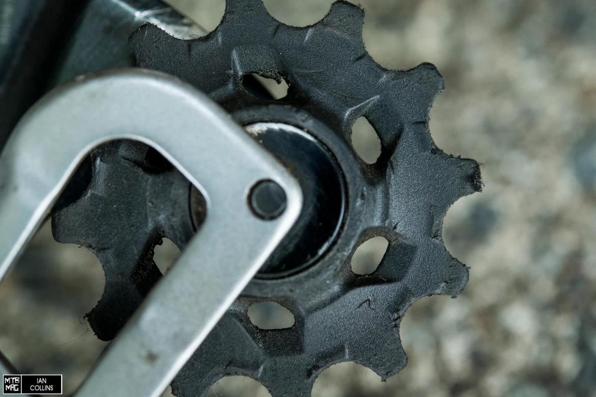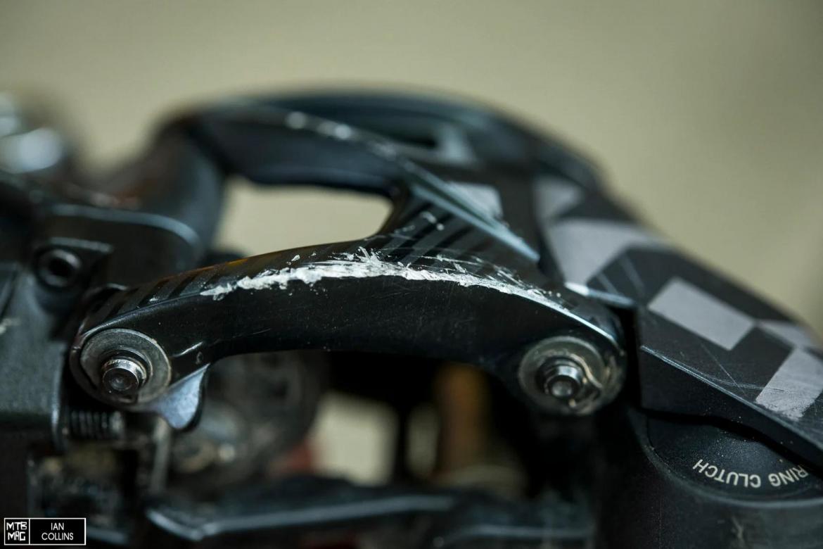 这个后拨经过多次与侧面障碍物的碰撞依然笔直,性能比我使用过的任何一款后拨都要好。SRAM的“Overload Clutch”(过载离合)是一项有趣的功能,可以让后拨在受到冲击时避开伤害。虽然看到他的演示很有趣,但我想知道这项功能在实际的林道使用中的表现如何。在经历了几次的碰撞,和多次木棍卡在其中和大量的石块撞击之后,他依旧运转如新。