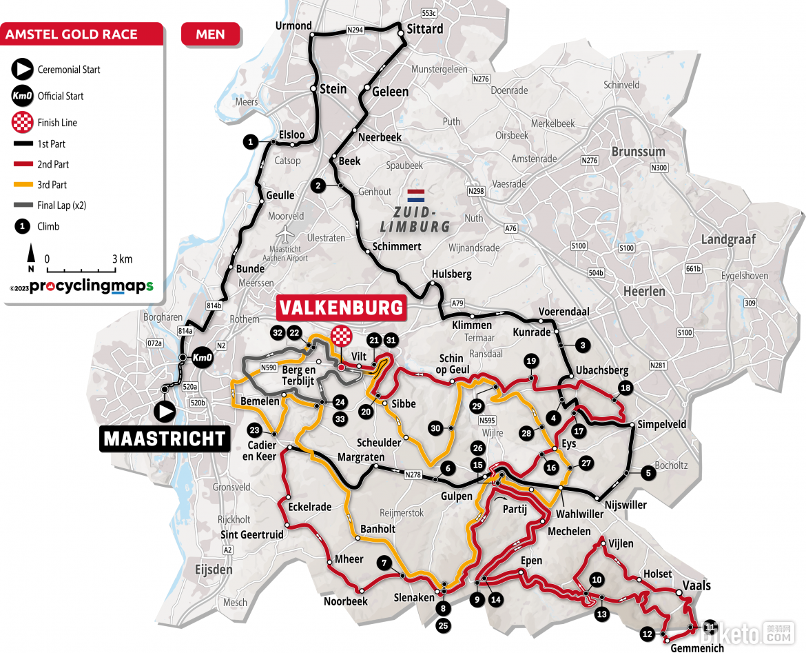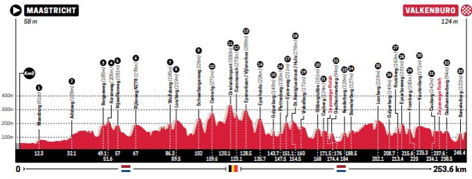 赛事路线。比赛从欧元诞生地——马斯特里赫特出发,北上到斯坦南下开启无尽的爬坡路段,其中穿过比利时、荷兰边境小镇——吉梅尼奇,最后在终点瓦尔肯堡一决胜负。由于途中33个爬坡点多为短陡坡的柏油路,选手选择合适的时机突围,再进行反复拉扯,最后拼耐力到最后的选手最有可能接近冠军。