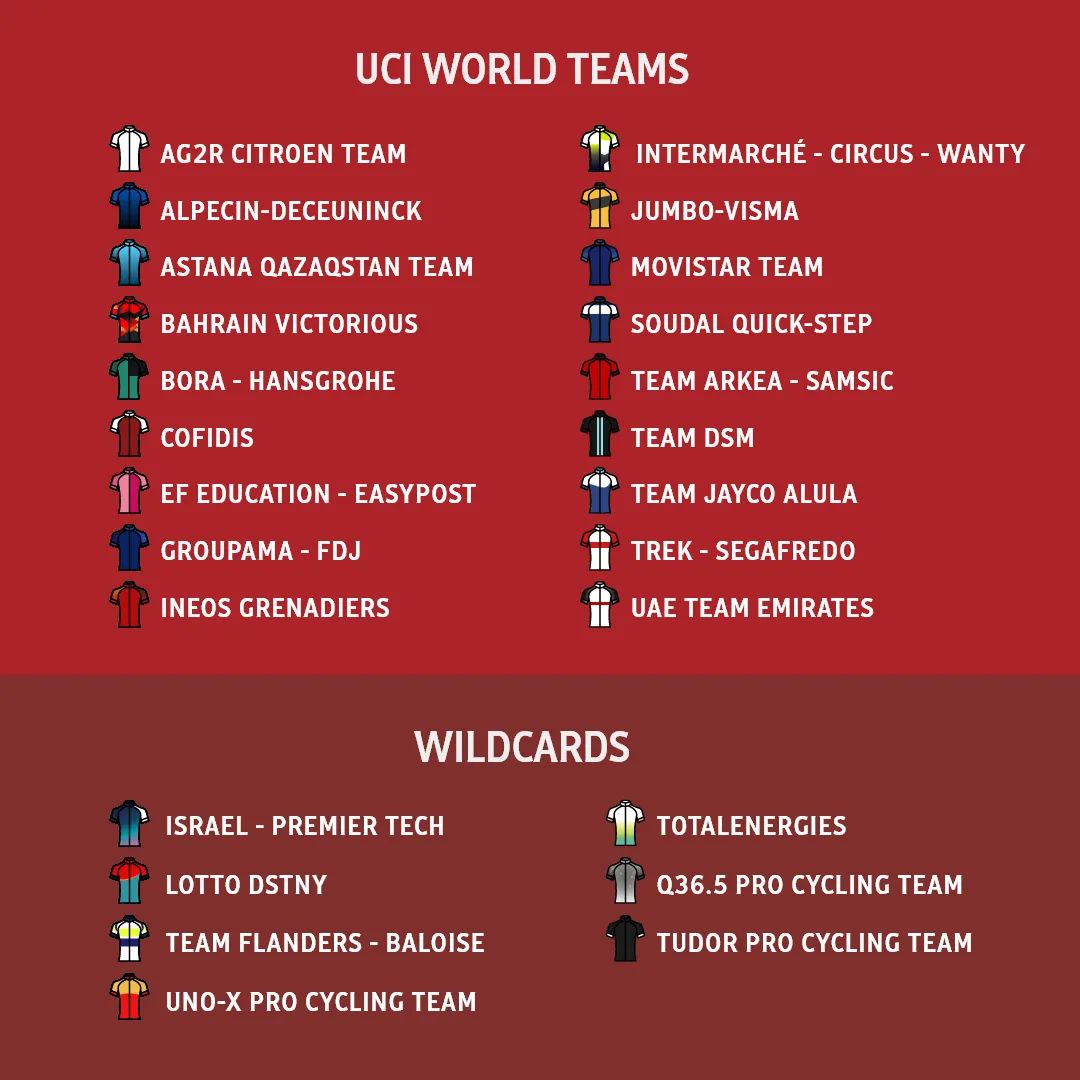 参赛车队。根据UCI规则共有25支车队参赛,其中有18支世巡赛车队和3支排名最高洲际职业队“直通”赛事,组委会另外给四支洲际职业队发放“外卡”,具体如下